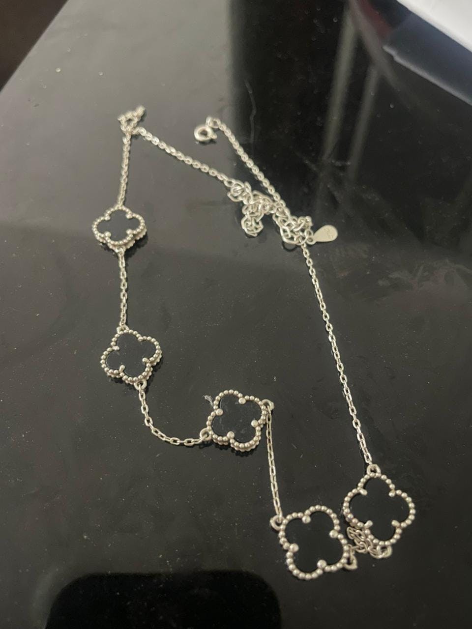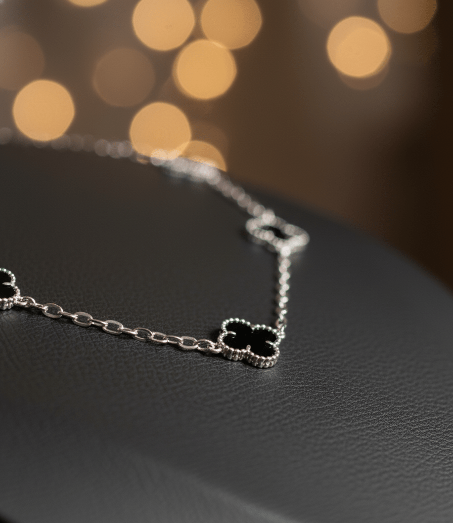 Cada um dos cinco pingentes de trevo é meticulosamente trabalhado com madrepérola preta genuína (ou "resina preta de alta qualidade", se for o caso), conhecida por seu brilho sutil e profundo que reflete a luz de maneira única. A corrente e os contornos dos trevos são confeccionados em Prata 925 de Lei, garantindo um acabamento duradouro, brilho intenso e sendo hipoalergênico, perfeito para peles sensíveis.