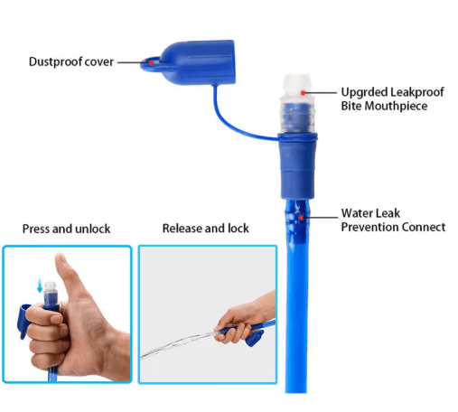 Tubo Isolado (Em Modelos Premium): O tubo de 95-105cm (aproximadamente) mantém a temperatura da água por mais tempo e facilita o acesso, mesmo em mochilas grandes.