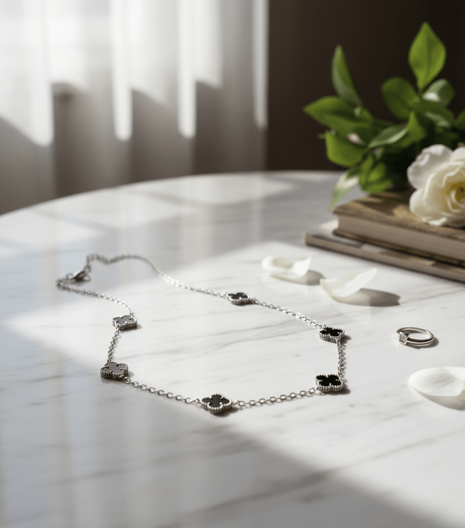 Cada um dos cinco pingentes de trevo é meticulosamente trabalhado com madrepérola preta genuína (ou "resina preta de alta qualidade", se for o caso), conhecida por seu brilho sutil e profundo que reflete a luz de maneira única. A corrente e os contornos dos trevos são confeccionados em Prata 925 de Lei, garantindo um acabamento duradouro, brilho intenso e sendo hipoalergênico, perfeito para peles sensíveis.