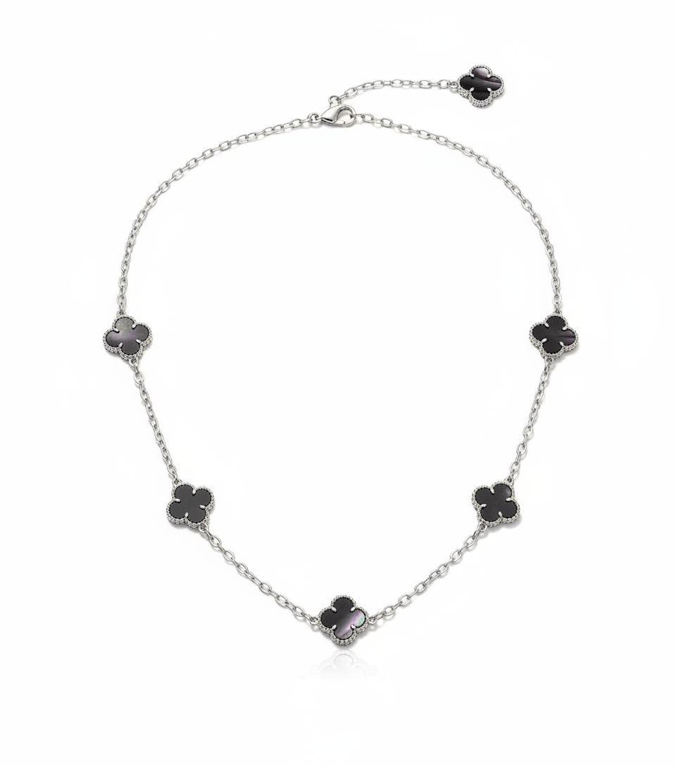 Colar Trevo da Sorte com 5 Pingentes em Madrepérola Preta - Elegância e Proteção